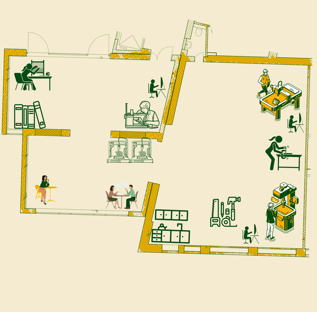 A place where creativity, craftsmanship and technology come together. Here you can work with a wide variety of materials such as textile, wood, acrylic and even soft metals to turn your ideas into reality. Whether you are a beginner or an experienced craftsperson, our creative zones are available around the clock (24/7) and offer you a well-equipped environment in which to realize your own projects or tinker with others.